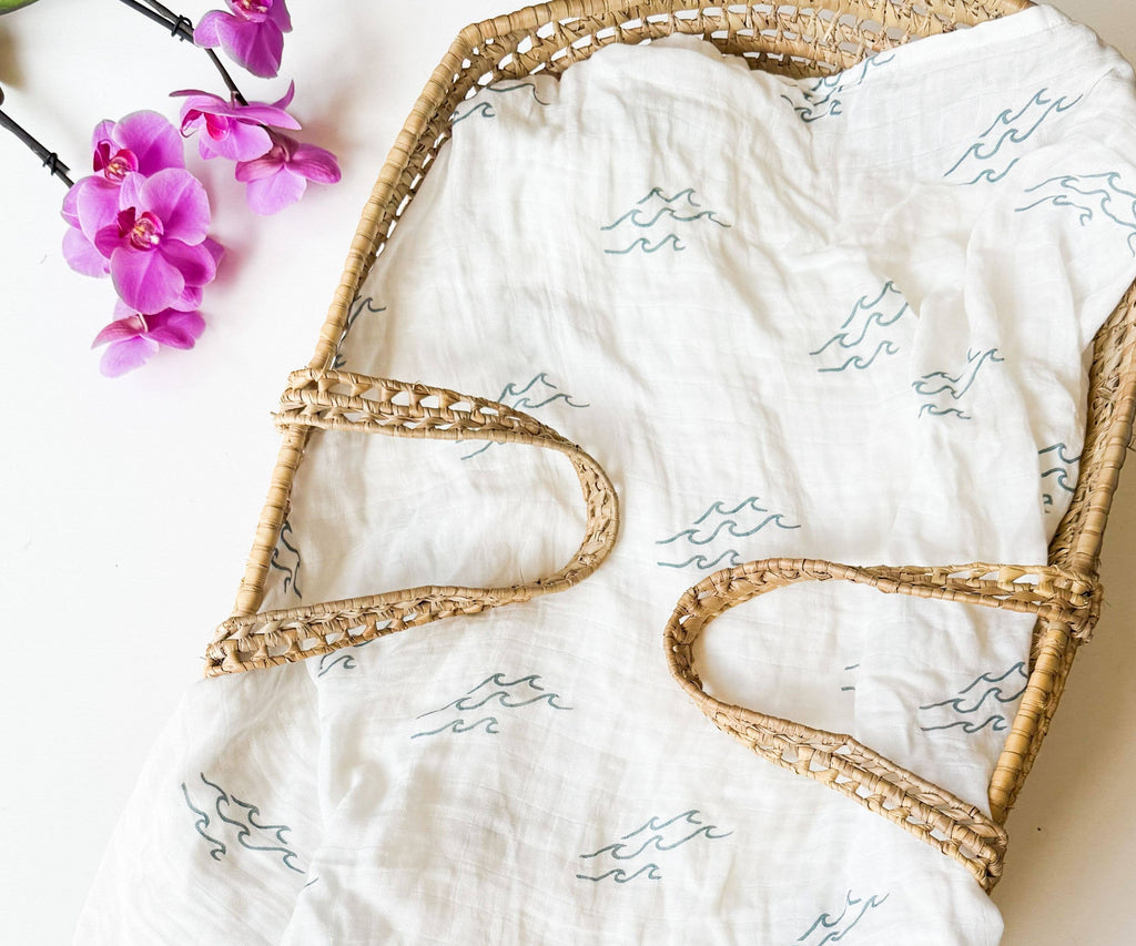 The Minimalist Wave Print organic muslin swaddle blanket is the perfect gift. Whether it's tummy time, preschool naps, or time for a stroll, our hypoallergenic swaddle is designed to grow with children, making it a perfect companion and keepsake. Not only is it incredibly soft, breathable, lightweight, and moisture-wicking, but its sustainable bamboo + cotton fabric also helps preserve our environment. Each swaddle is beautifully packaged in eco-friendly organic cotton ribbon with deluxe cardstock and is ready to gift.