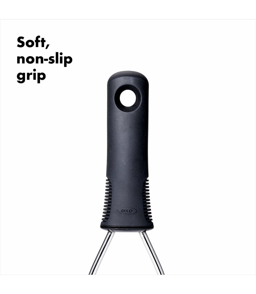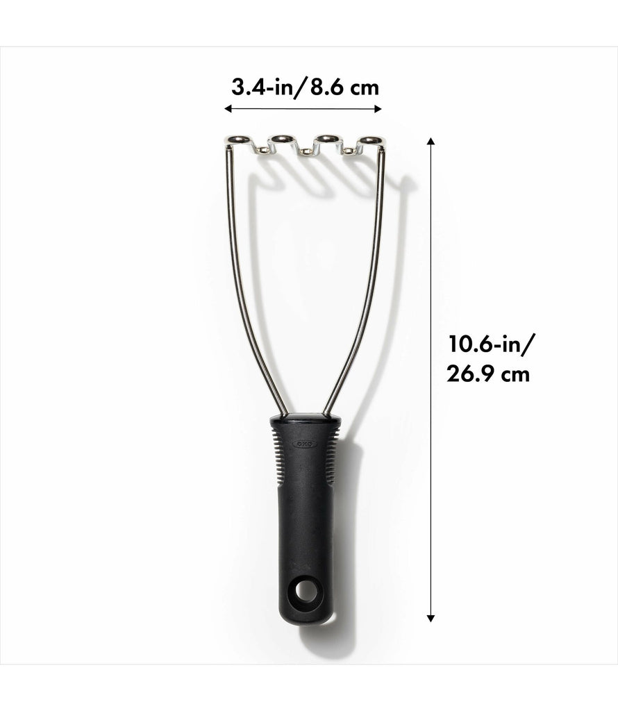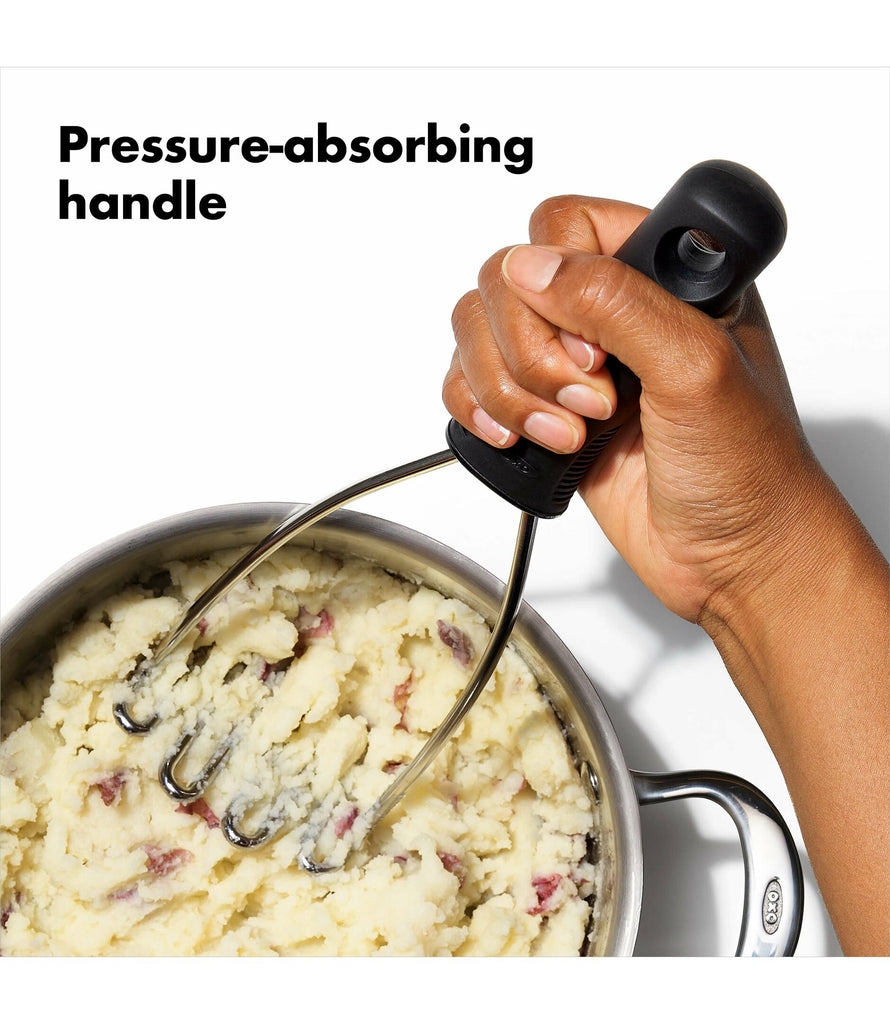 The OXO Good Grips Potato Masher features a sturdy, stainless steel head that efficiently mashes potatoes—and yams, carrots, plantains and more. It’s also great for mashing apples and bananas for baby food. The soft, non-slip handle is designed to stay comfortable during repetitive motion, and it absorbs pressure to reduce strain. It includes a large in-handle hole for hanging storage. Dishwasher safe.