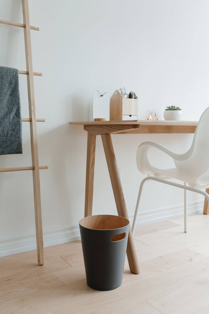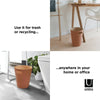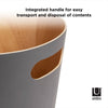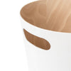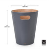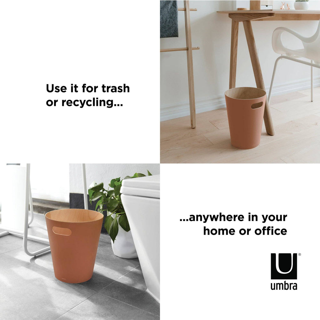 Umbra Woodrow Trash Can 2-Gallon (7.5 L) CapacityWoodrow is a contemporary waste can that adds a modern touch to any space. The two-tone can combines a natural wood interior with a stained finish on the outer surface, which helps to warm and ground a room. Featuring conveniently integrated handles, Woodrow is freely moveable and disposing of waste and recycling is hassle-free. The beautifully curved wooden can is perfect for any powder room, bathroom, office, or study, and transforms a basic household product into an eye-catching piece of decor. Measuring 9” in diameter and 11” tall with a capacity of 2 gallons (7.5 L), Woodrow trash can is great for small spaces.